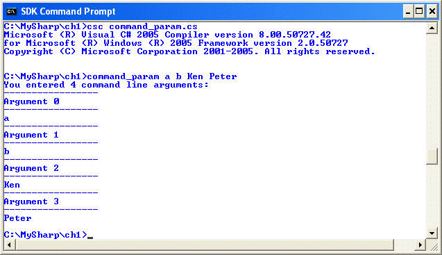 using System; //command_param.cs public class test_com_para { public static void Main(string[] str) { Console.WriteLine("You entered {0} command line arguments:", str.Length ); for (int i=0; i < str.Length; i++) { Console.WriteLine("-----------------"); Console.WriteLine("Argument {0}", i); Console.WriteLine("-----------------"); Console.WriteLine("{0}", str[i]); } } } |