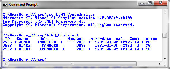 List<ObjectFacotry> empdb = getEmp(); IEnumerable<ObjectFacotry> query1 = empdb.Where(emp => emp.job.Contains("MANAG"));