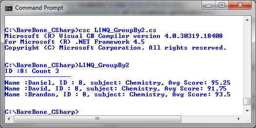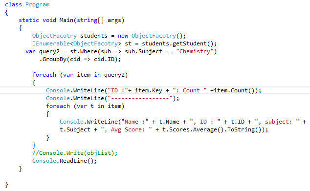 var query2 = st.Where(sub => sub.Subject == "Chemistry").GroupBy(cid => cid.ID); item.Key Console.WriteLine("ID :"+ item.Key + ": Count " +item.Count());