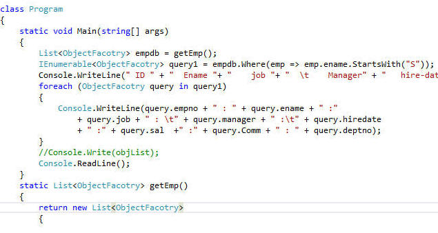 IEnumerable<ObjectFacotry> query1 = empdb.Where(emp => emp.ename.StartsWith("S"));