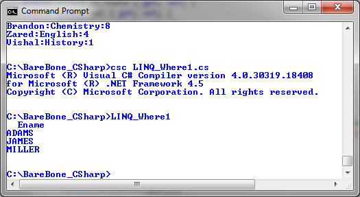 IEnumerable<string> query1 = from emp in empdb where emp.job == "CLERK" select emp.ename;