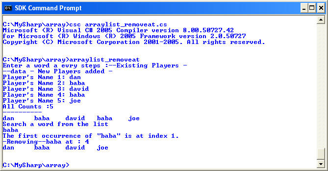 Console.WriteLine( "-Removing--" + search + " at : " + (mylast+1) );