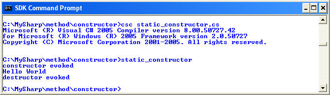 using System; //static_constructor.cs public class stat_construct { private static string strstat_construct; //public stat_construct() { Console.WriteLine("constructor evoked"); } ~stat_construct() { Console.WriteLine("destructor evoked"); } static stat_construct() { Console.WriteLine("constructor evoked"); strstat_construct = "Hello World"; } // call a variable that is set within a //static constructor with a public method // i don't see much use of it now //any way i know it can be used public void writestat_construct() { Console.WriteLine(strstat_construct); } } class test { public static void Main() { stat_construct sc = new stat_construct(); sc.writestat_construct(); } } |