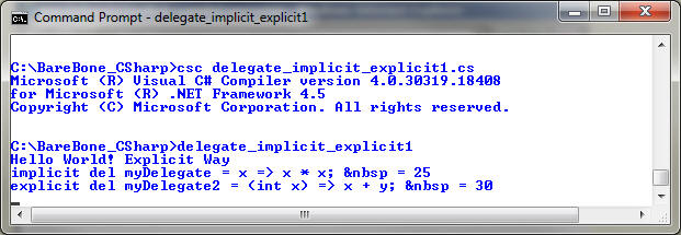 Console.WriteLine("implicit del myDelegate = x => x * x;   = " +