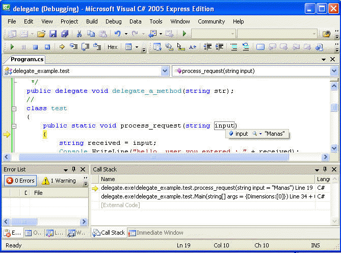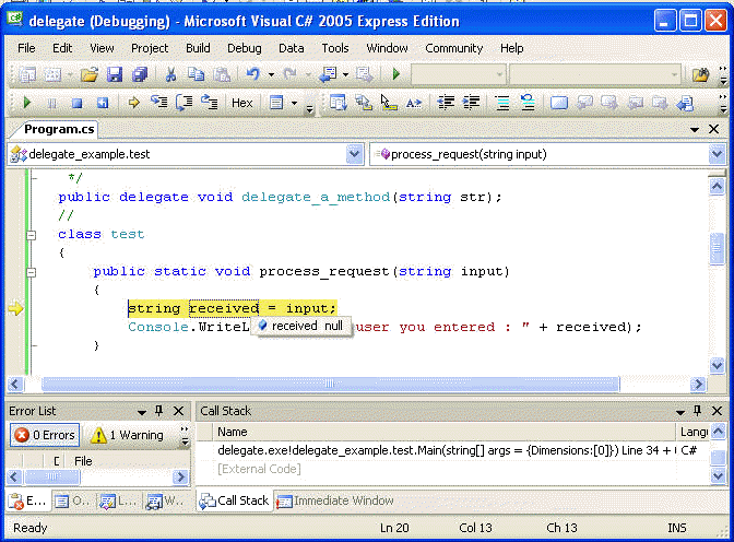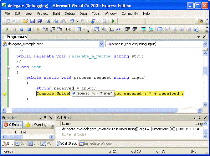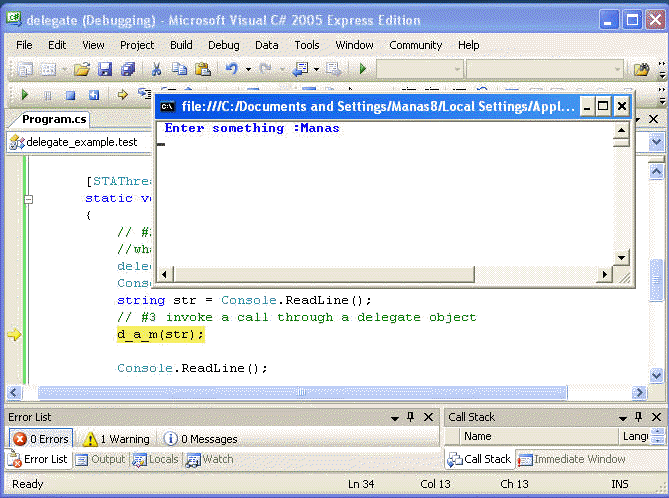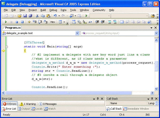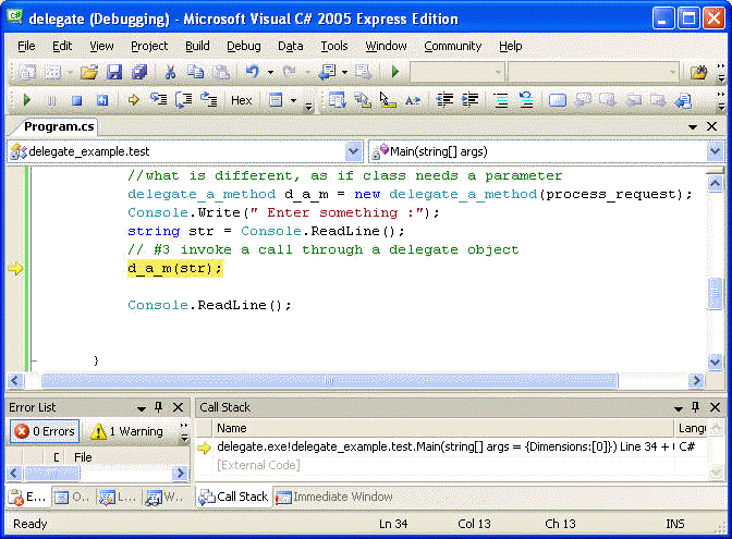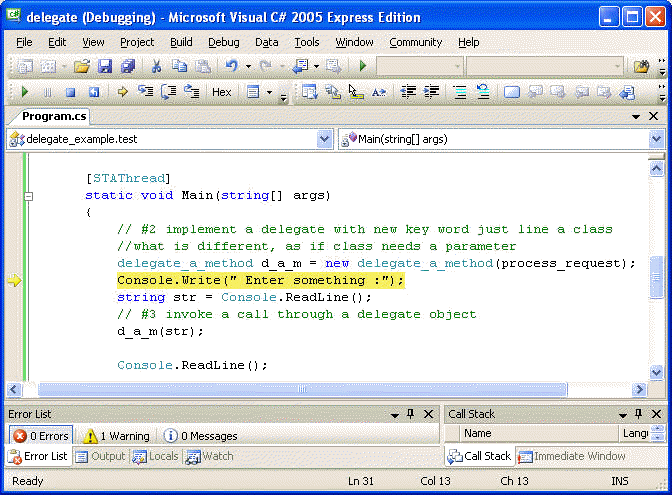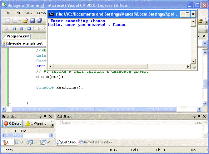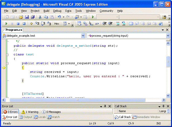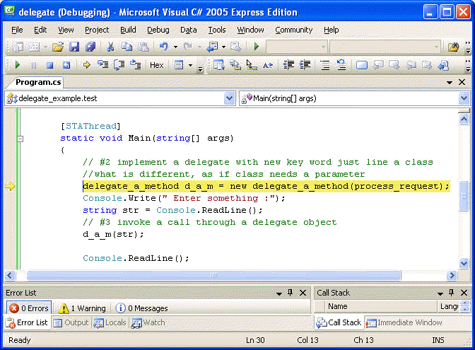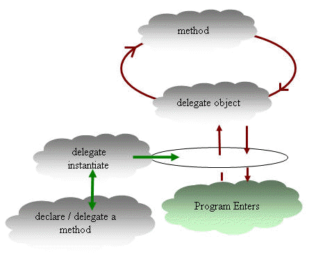 using System; using System.Collections.Generic; using System.Text; namespace delegate_example { // #1 delcare a delegate /* * use the keyword delegate * name the method you will be encapsulating * and its return type */ public delegate void delegate_a_method(string str); // class test { public static void process_request(string input) { string received = input; Console.WriteLine("hello, user you entered : " + received); } [STAThread] static void Main(string[] args) { // #2 implement a delegate with new key word just line a class //what is different, as if class needs a parameter delegate_a_method d_a_m = new delegate_a_method(process_request); Console.Write(" Enter something :"); string str = Console.ReadLine(); // #3 invoke a call through a delegate object d_a_m(str); Console.ReadLine(); } } } |