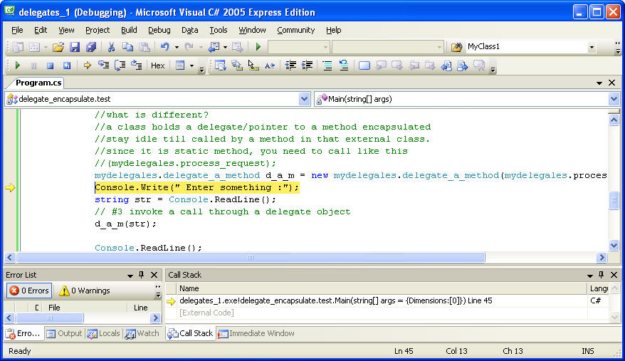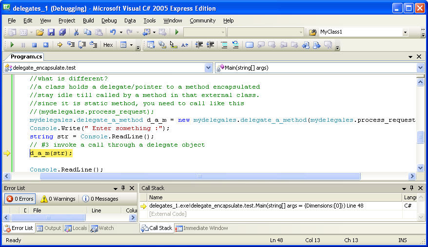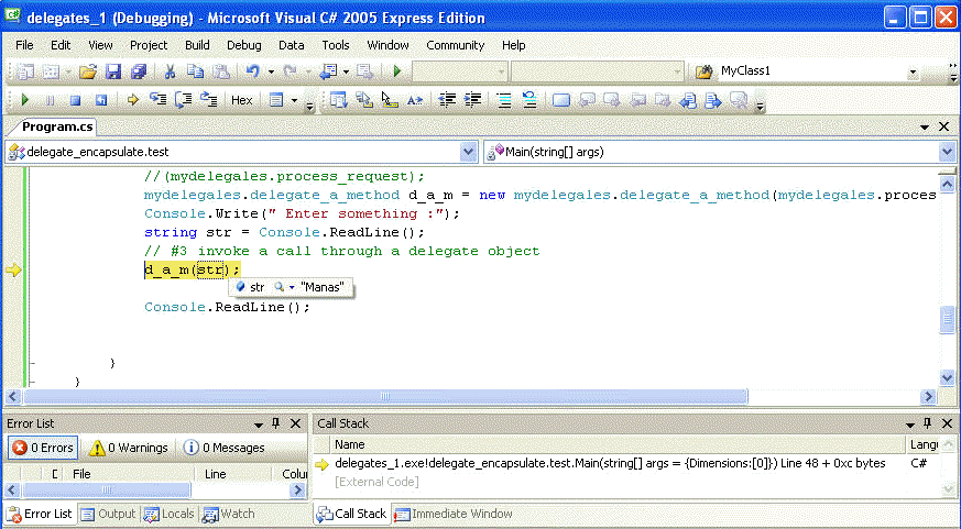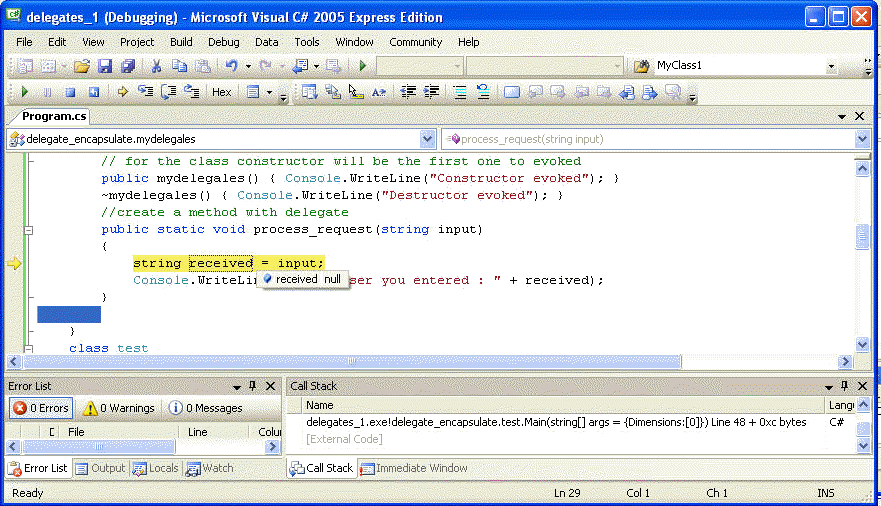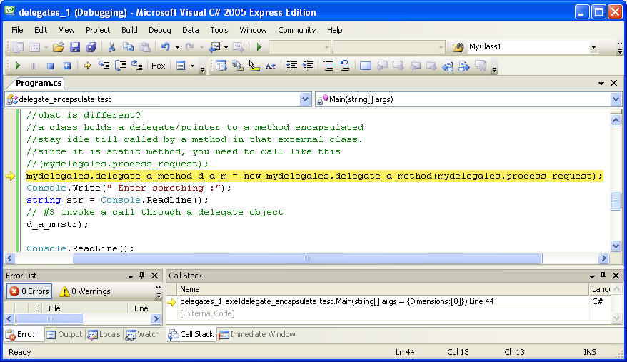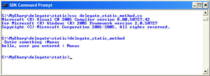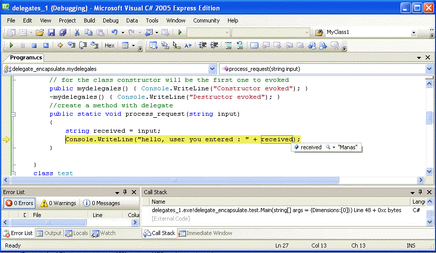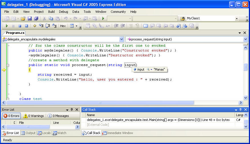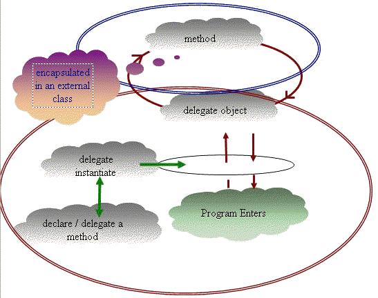 using System; using System.Collections.Generic; using System.Text; namespace delegate_encapsulate { // #1 declare a delegate /* * use the keyword delegate * name the method you will be encapsulating * and its return type */ // start a new class with curlies class mydelegales { public delegate void delegate_a_method(string str); // delegates first or constructor first // for the class constructor will be the first one to evoked public mydelegales() { Console.WriteLine("Constructor evoked"); } ~mydelegales() { Console.WriteLine("Destructor evoked"); } //create a method with delegate public static void process_request(string input) { string received = input; Console.WriteLine("hello, user you entered : " + received); } } class test { [STAThread] static void Main(string[] args) { // #2 implement a delegate with new key word just line a class //what is different? //a class holds a delegate/pointer to a method encapsulated //stay idle till called by a method in that external class. //since it is static method, you need to call like this //(mydelegales.process_request); mydelegales.delegate_a_method d_a_m = new mydelegales.delegate_a_method(mydelegales.process_request); Console.Write(" Enter something :"); string str = Console.ReadLine(); // #3 invoke a call through a delegate object d_a_m(str); Console.ReadLine(); } } } |