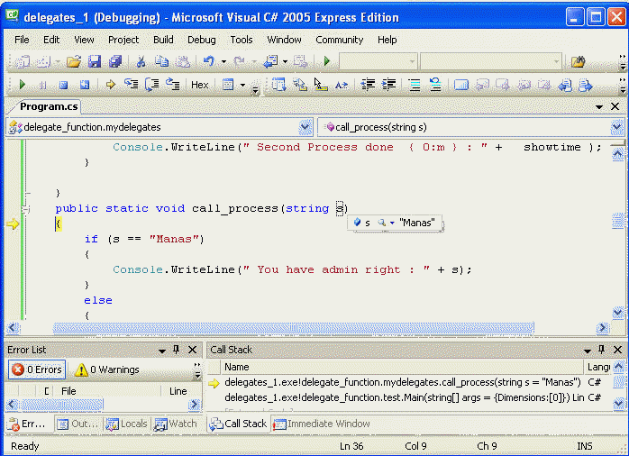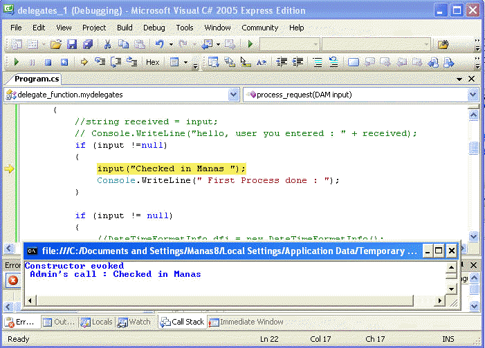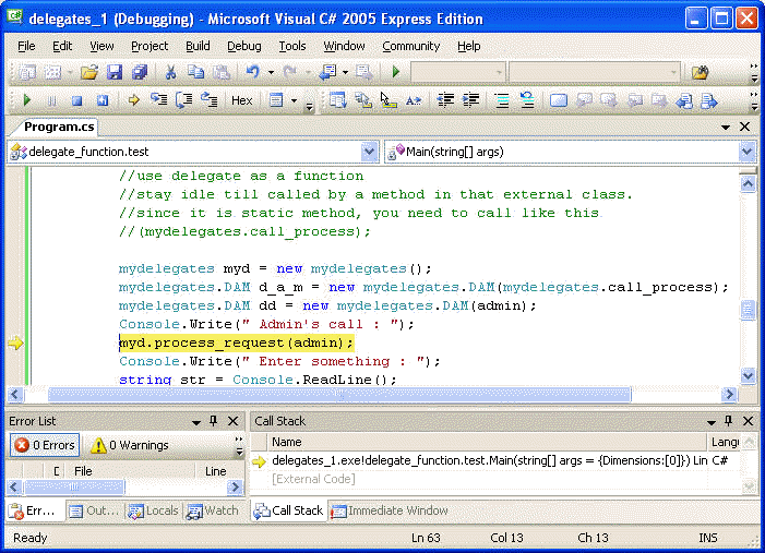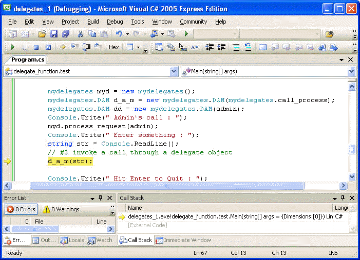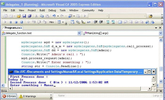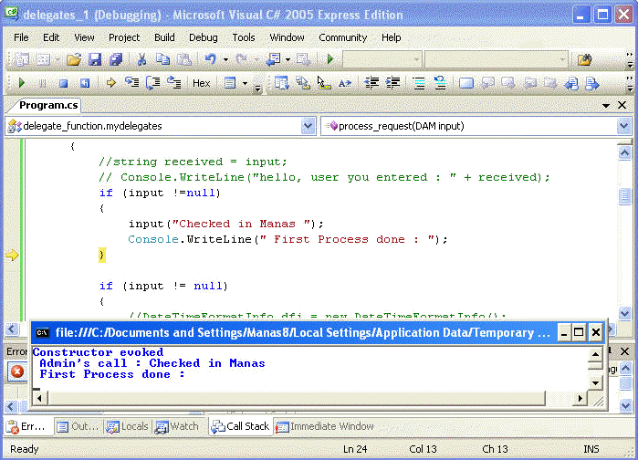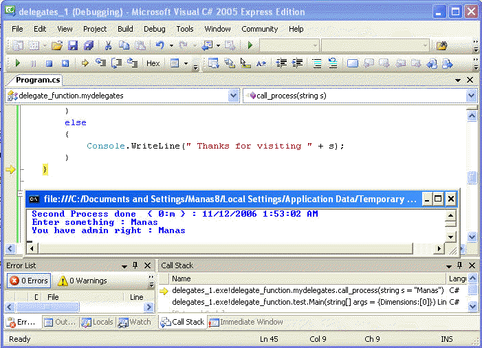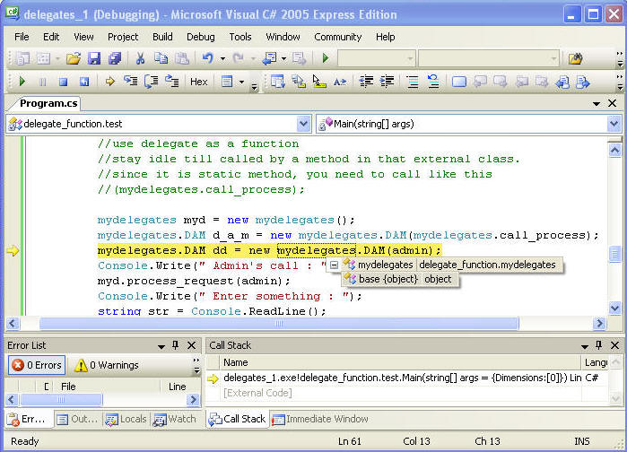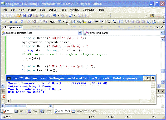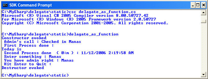 using System; using System.Collections.Generic; using System.Text; namespace delegate_function { class mydelegates { public delegate void DAM(string str); // delegates first or constructor first // for the class constructor will be the first one to evoked public mydelegates() { Console.WriteLine("Constructor evoked"); } ~mydelegates() { Console.WriteLine("Destructor evoked"); } //create a method with delegate public void process_request(DAM input) { if (input !=null) { input("Checked in Manas "); Console.WriteLine(" First Process done : "); } if (input != null) { DateTime showtime = DateTime.Now; input("Today is "); Console.WriteLine(" Second Process done { 0:m } : " + showtime ); } } public static void call_process(string s) { if (s == "Manas") { Console.WriteLine(" You have admin right : " + s); } else { Console.WriteLine(" Thanks for visiting " + s); } } } class test { static void admin(string ns) { Console.WriteLine(ns); } static void Main(string[] args) { // #2 implement a delegate with new key word just line a class //what is different? //a class holds a delegate/pointer to a method encapsulated //stay idle till called by a method in that external class. //since it is static method, you need to call like this //(mydelegates.call_process); mydelegates myd = new mydelegates(); mydelegates.DAM d_a_m = new mydelegates.DAM(mydelegates.call_process); mydelegates.DAM dd = new mydelegates.DAM(admin); Console.Write(" Admin's call : "); myd.process_request(admin); Console.Write(" Enter something : "); string str = Console.ReadLine(); // #3 invoke a call through a delegate object d_a_m(str); Console.Write(" Hit Enter to Quit : "); Console.ReadLine(); } } } |