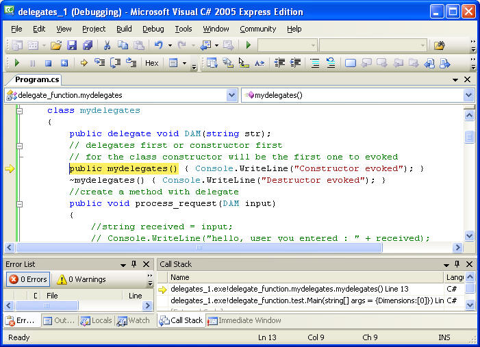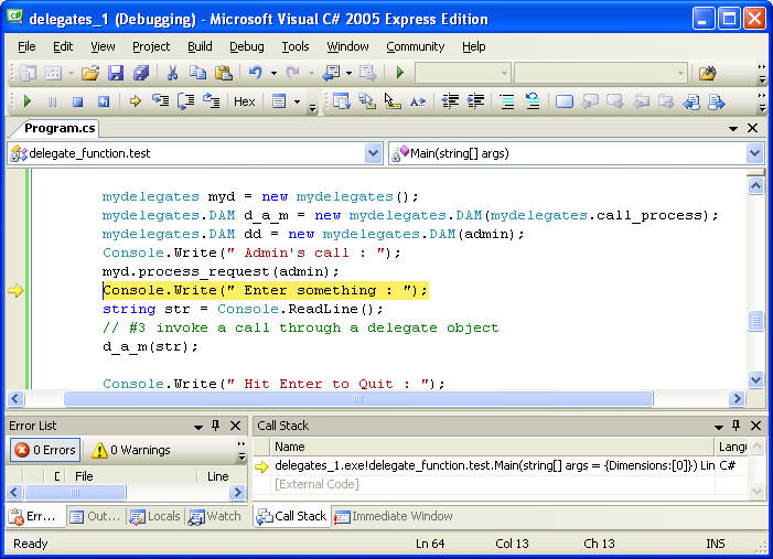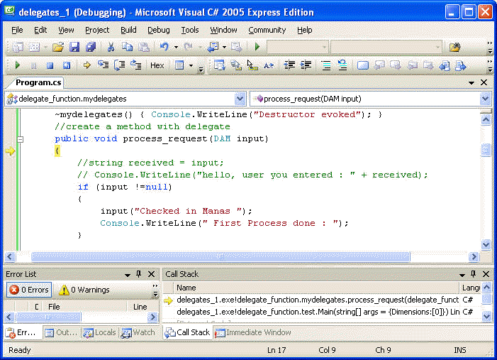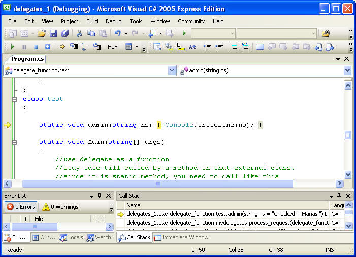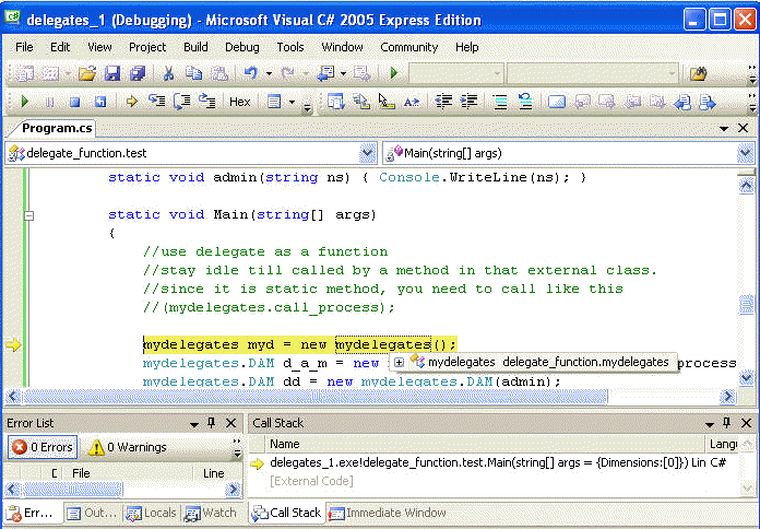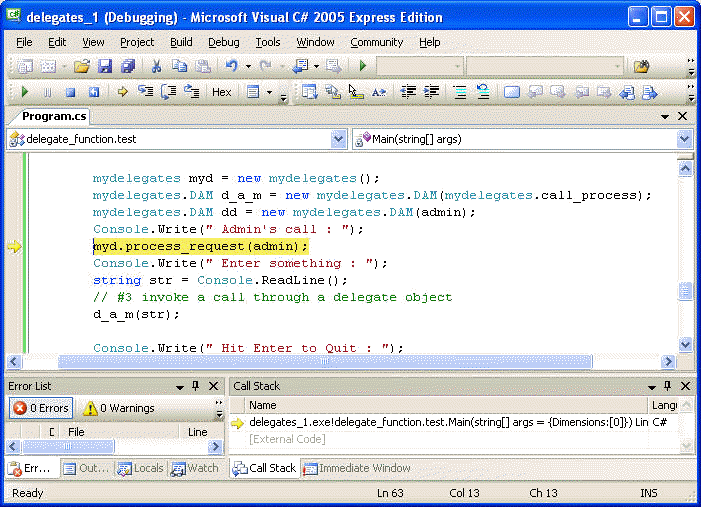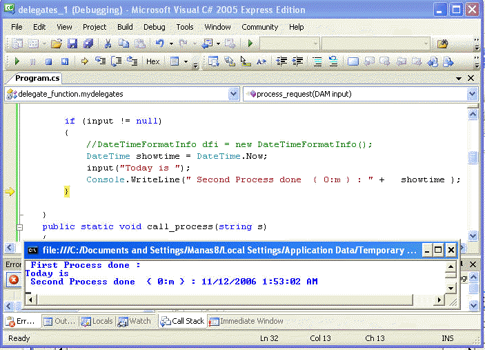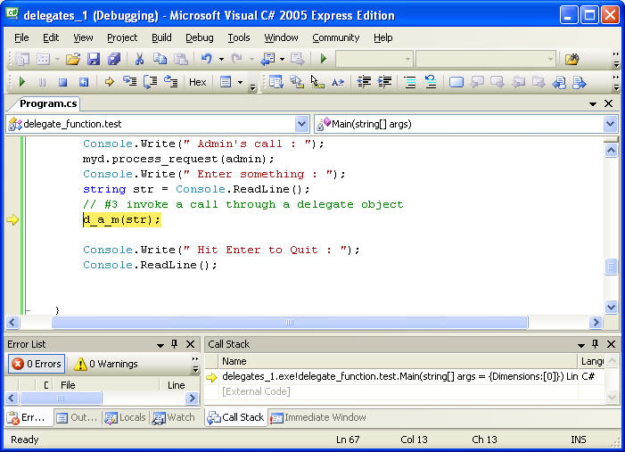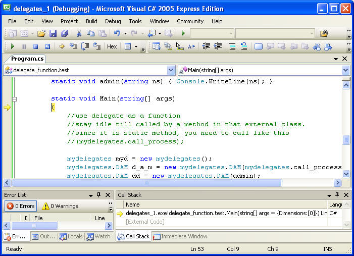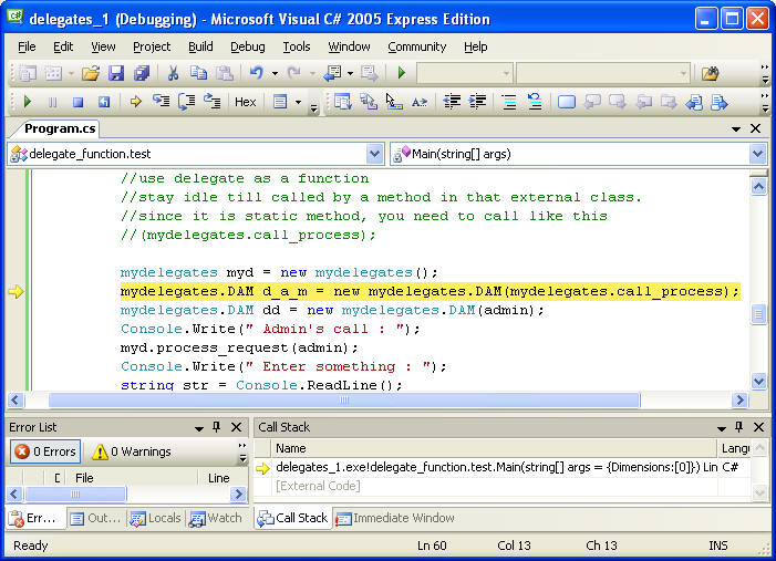 using System; using System.Collections.Generic; using System.Text; namespace delegate_function { class mydelegates { public delegate void DAM(string str); // delegates first or constructor first // for the class constructor will be the first one to evoked public mydelegates() { Console.WriteLine("Constructor evoked"); } ~mydelegates() { Console.WriteLine("Destructor evoked"); } //create a method with delegate public void process_request(DAM input) { if (input !=null) { input("Checked in Manas "); Console.WriteLine(" First Process done : "); } if (input != null) { DateTime showtime = DateTime.Now; input("Today is "); Console.WriteLine(" Second Process done { 0:m } : " + showtime ); } } public static void call_process(string s) { if (s == "Manas") { Console.WriteLine(" You have admin right : " + s); } else { Console.WriteLine(" Thanks for visiting " + s); } } } class test { static void admin(string ns) { Console.WriteLine(ns); } static void Main(string[] args) { // #2 implement a delegate with new key word just line a class //what is different? //a class holds a delegate/pointer to a method encapsulated //stay idle till called by a method in that external class. //since it is static method, you need to call like this //(mydelegates.call_process); mydelegates myd = new mydelegates(); mydelegates.DAM d_a_m = new mydelegates.DAM(mydelegates.call_process); mydelegates.DAM dd = new mydelegates.DAM(admin); Console.Write(" Admin's call : "); myd.process_request(admin); Console.Write(" Enter something : "); string str = Console.ReadLine(); // #3 invoke a call through a delegate object d_a_m(str); Console.Write(" Hit Enter to Quit : "); Console.ReadLine(); } } } |