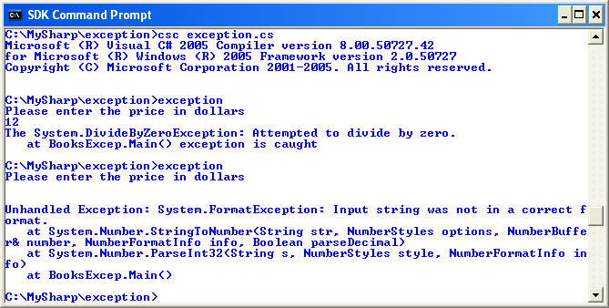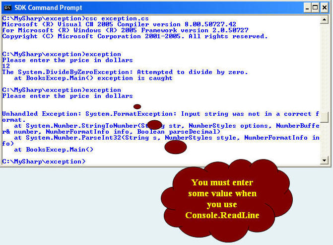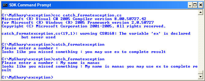 using System; //handle System.FormatException generated from //not entering the feed to Console.ReadLine() at the command prompt //csc catch_formatexception.cs class test { static void Main() { Console.Write("Please enter a number :"); string str = Console.ReadLine(); int n; try { n = Int32.Parse(str); Console.WriteLine("Here Number your entered no problem"); } catch(Exception ex) { Console.WriteLine("looks like you missed something :"+ str + " you may use ex to complete result" ); } } } |