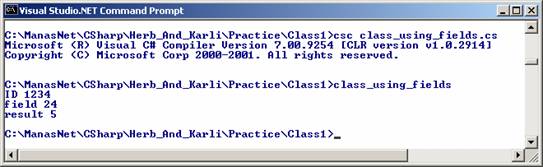 using System; //csc class_using_fields.cs class using_fields { public const int one = 1, two = 2, three = 3; public readonly int ID =1234; int field =24; public static void Main() { using_fields ufs = new using_fields(); int result = (one * two ) + three; Console.WriteLine("ID "+ ufs.ID); Console.WriteLine("field " + ufs.field); Console.WriteLine("result " + result); }