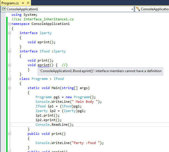 Error 1 'ConsoleApplication1.Ifood.eprint()': interface members cannot have a definition