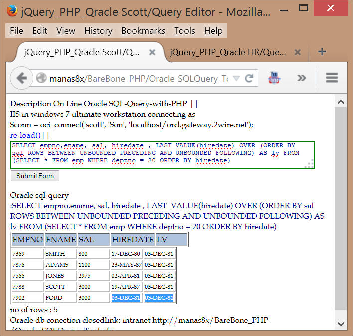 SELECT empno,ename, sal, hiredate , LAST_VALUE(hiredate) OVER (ORDER BY sal ROWS BETWEEN UNBOUNDED PRECEDING AND UNBOUNDED FOLLOWING) AS lv FROM (SELECT * FROM emp WHERE deptno = 20 ORDER BY hiredate)
