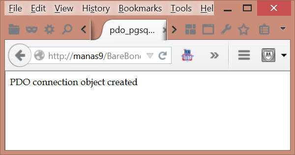 <html><head> <title> pdo_pgsql1.php</title> <head> <body> <?php try { $db = new PDO("pgsql:dbname=pgsdemo1;host=localhost", "manas237", "pwmanas237" ); echo "PDO connection object created"; } catch(PDOException $e) { echo $e->getMessage(); } ?> </body> </html> |