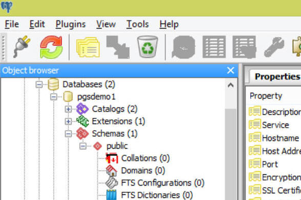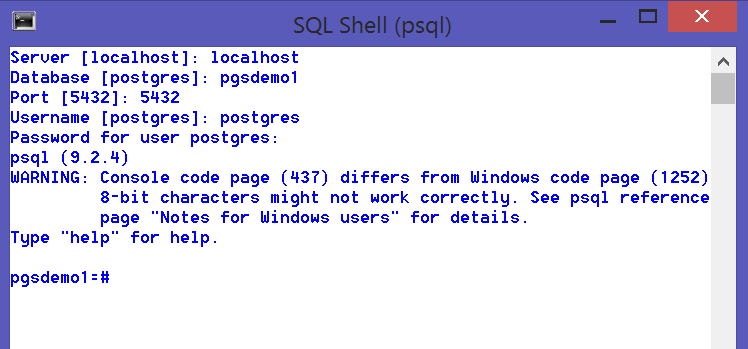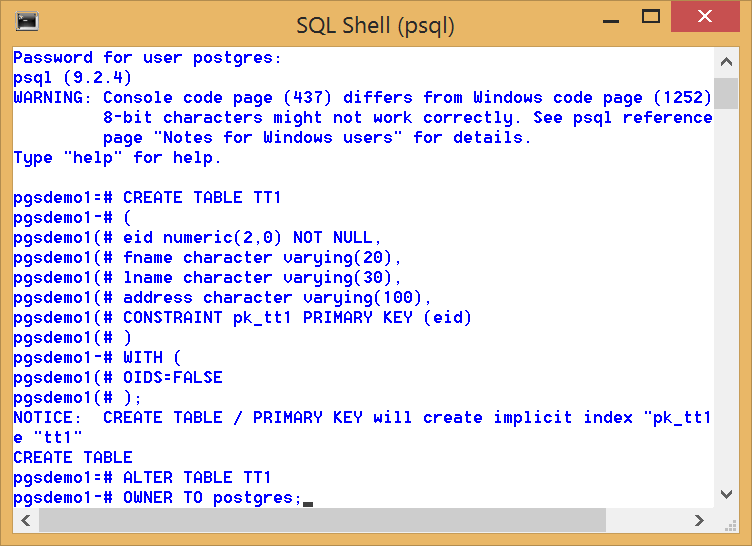 Screen shot Postgresql db, pgsdemo1: before creating a table, named
