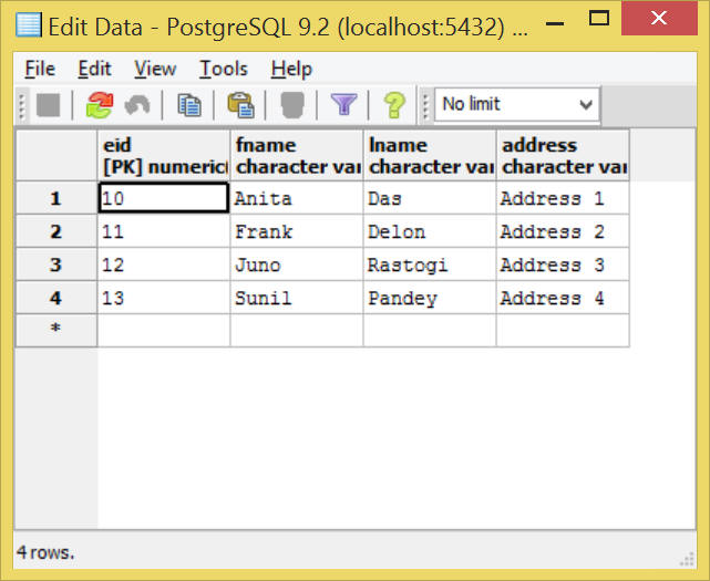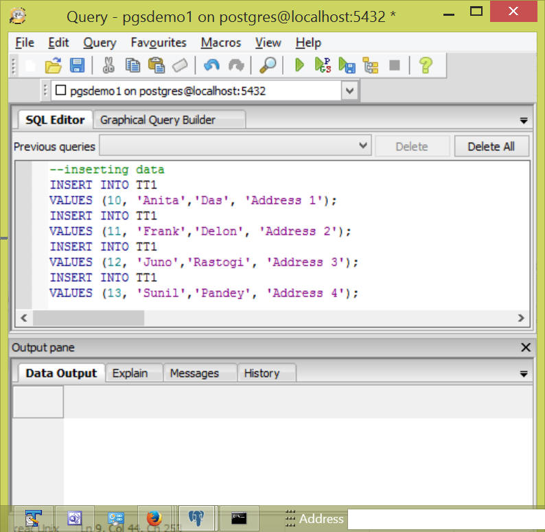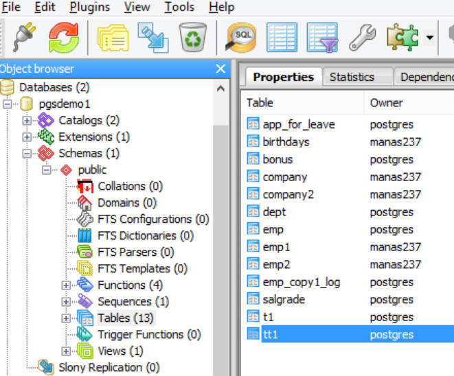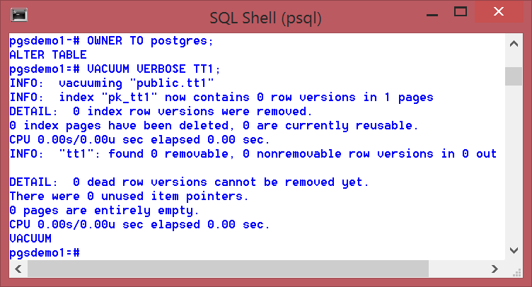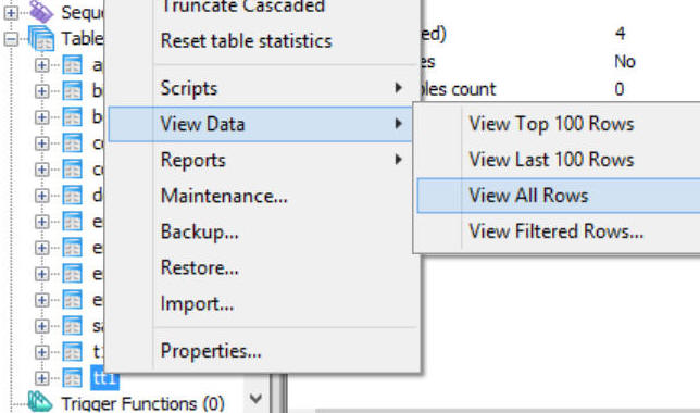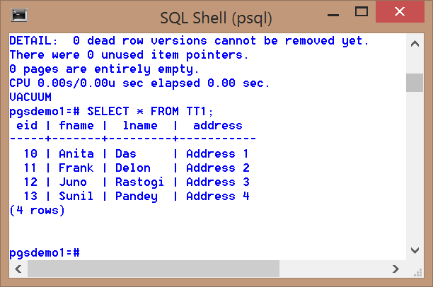Note the table created I did psql.pane and updated this table, then ran vacuum command The above screen shot suggested that "TT1" table did not have any row yet. PostgreSQL db uses MVCC, and differs from Oracle transaction isolation Now let us view all data, PostgreSQL view data menu displays the table with write/edit option Now let us go back to psql |
